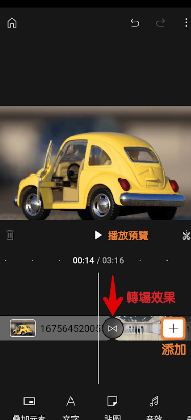 3. 汇入档案就自动建立影片,每个影片和照片都成为一个片段,两个片段中间可添加转场效果,下方有叠加元素、文字、贴图、音效、旁白等编辑项目。