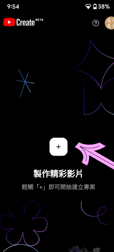 1、前往 Play 商店安装 YouTube Create,打开 App 登入 Google 帐户即可免费使用,在首页点击「+」开始建立专案。