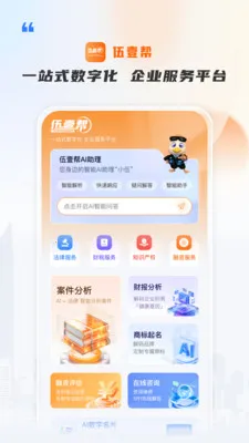 伍壹帮企服平台APP是一站式数字化企业服务平台,整合法律、财税、知识产权、融资等服务。有智能案件分析、法规查询等功能,还有四大专业AI助手、企服管家团队及会员权益体系,为企业经营保驾护航,新版优化数据看板等。