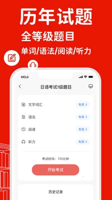 1. MOJiTest-JLPT日语能力考考研最新版专注日语备考,有考级权威词库。