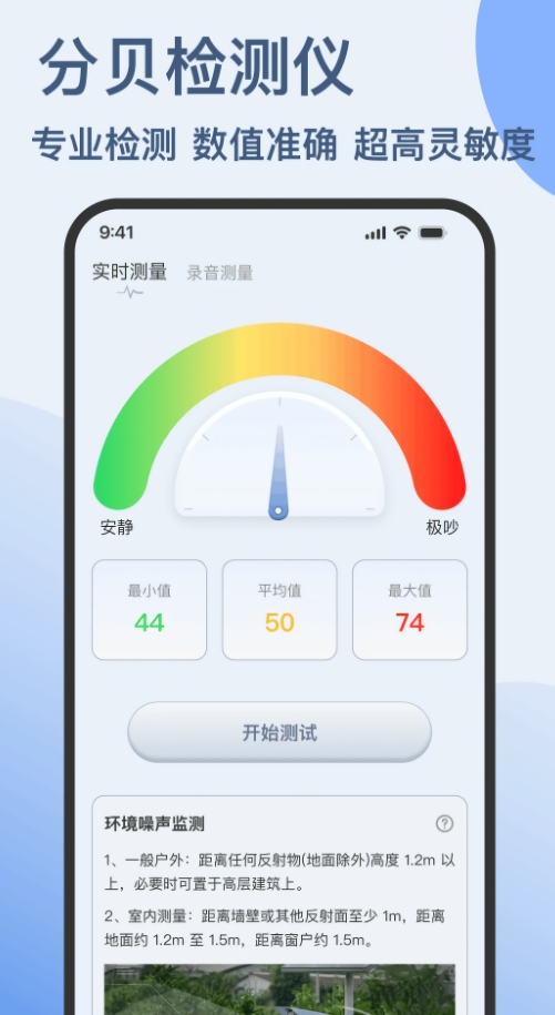 1. 高精度数据查看:能提供高精度的分贝测试数据,用户可随时进行测试,精准了解环境噪音情况。