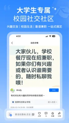 2. 真实社区:全大学生实名认证,杜绝广告骚扰,打造纯净校园社交环境。