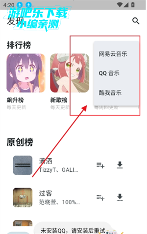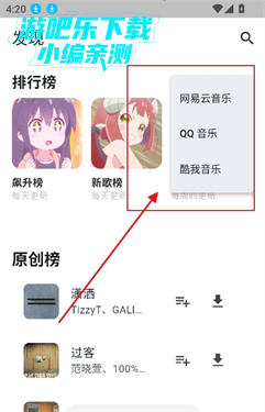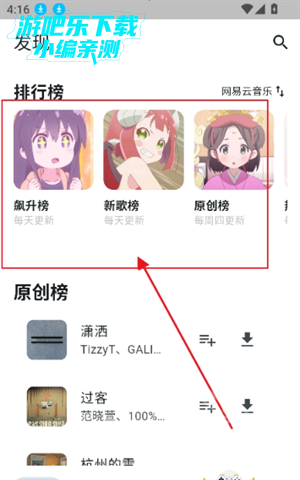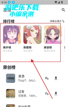 1、进入首页,可以查看原创榜,新歌榜等榜单内容