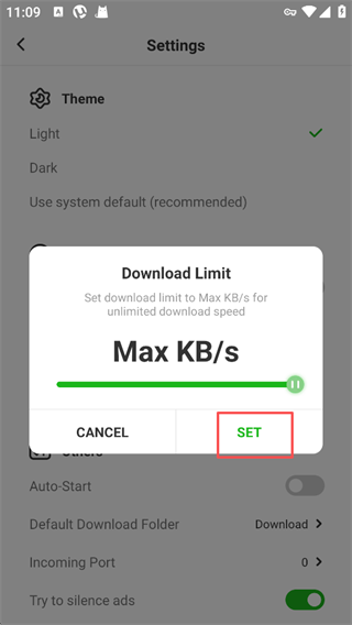 5、调试完成点击【SET】设定。这样当你在安卓上下载种子流时,就会将新的下载速度设置为uTorrent的上限。