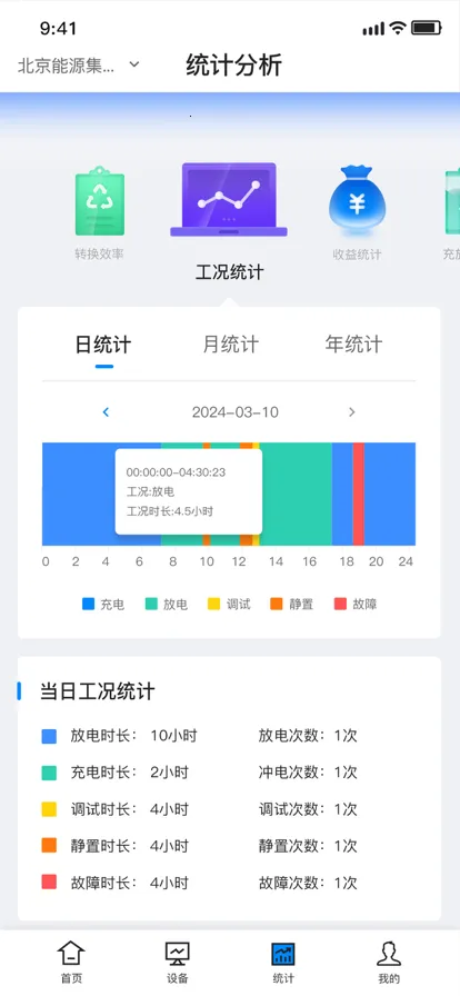 2. 统计分析精准:通过统计图表对站点的充放电量、收益、转换效率、工况等信息进行统计,为决策提供有力依据。