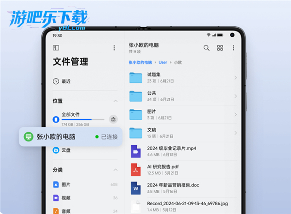 操作:平板文件管理 → 跨端设备 → 选择已连接手机 → 浏览 / 编辑 / 传输文件
