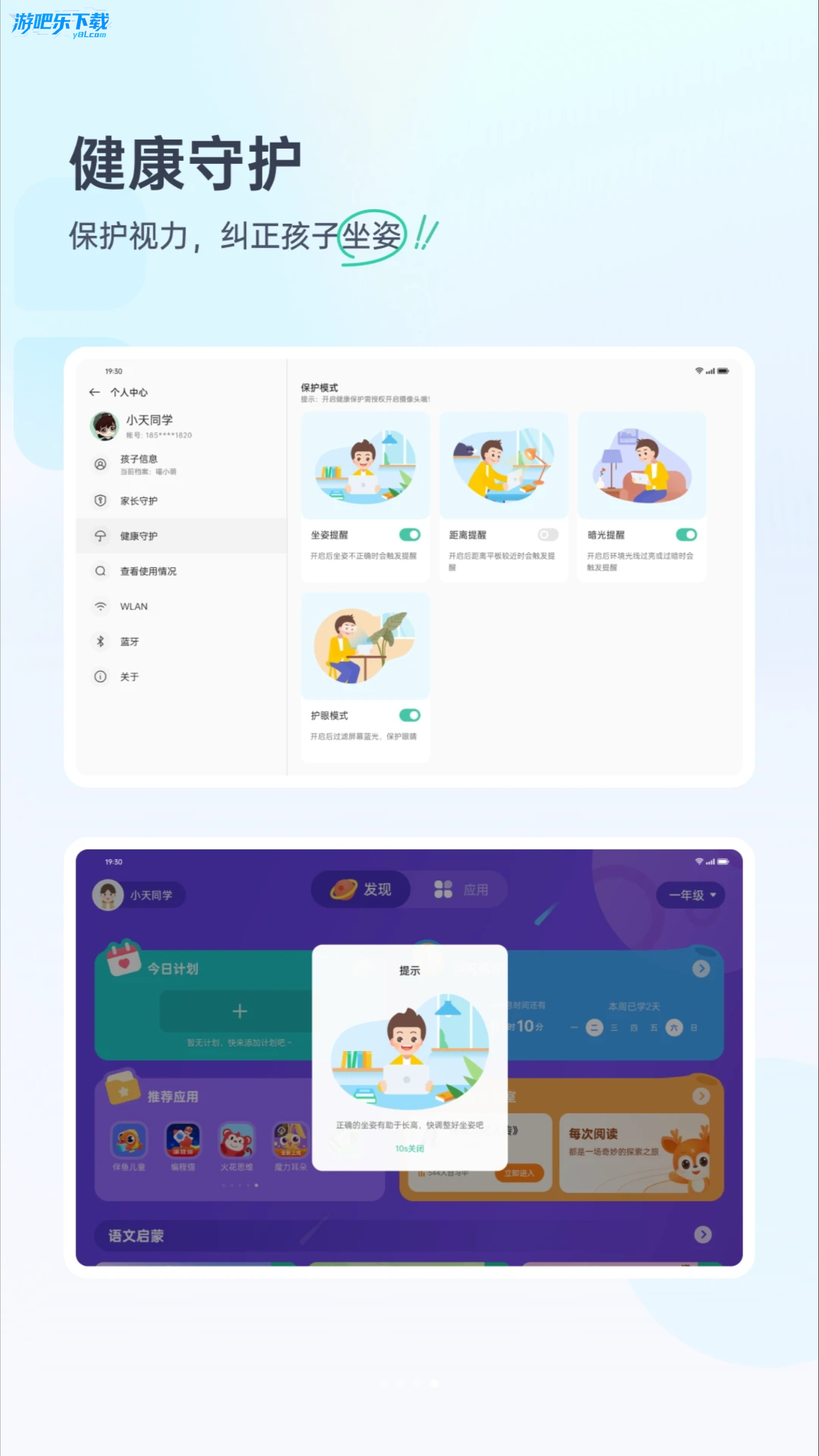 开启健康守护功能(家长守护内),可同时设置坐姿提醒、距离提醒和护眼模式,全方位保护孩子学习健康