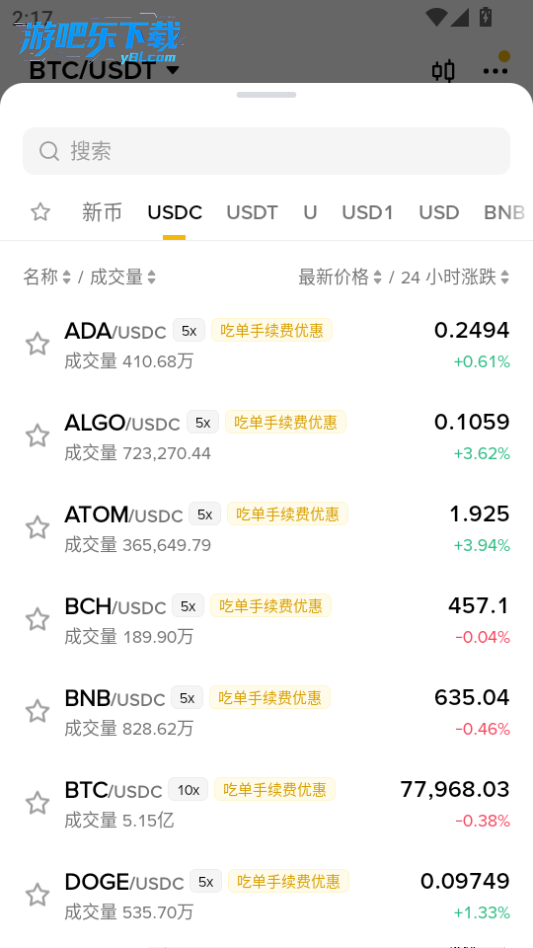 搜索选择USDT(或 BTC/ETH/BNB 等)。