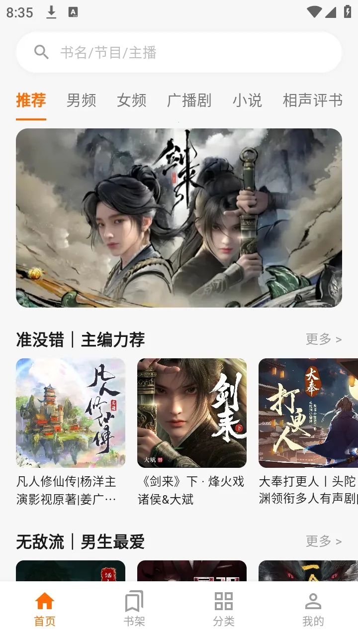 1、软件首页为大家推荐了众多热门广播剧资源,用户可以根据频道或者类型筛选。
