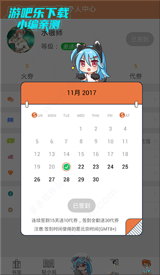 2、每天进行签到之后就能获得5点代券,可以用这个代券来看书。一般来说签到2天可以免费看一章vip,连续签到15天额外赠送10代券,30天赠送30代券。