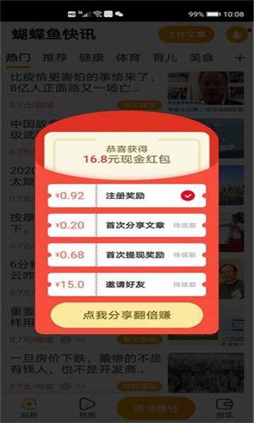 用户只需移动手指就可以阅读蝴蝶鱼、阅读应用程序并转发这些文章和信息,就可以获得丰厚的佣金奖励。