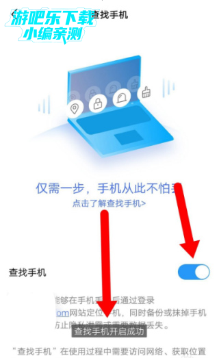 4、显示“查找设备开启成功"的提示,代表查找设备功能已经可以使用。在开启过程中需要访问网络、获取位置信息以及发送一条普通短信,短信费用由运营商收取