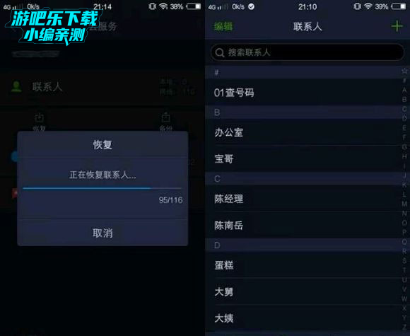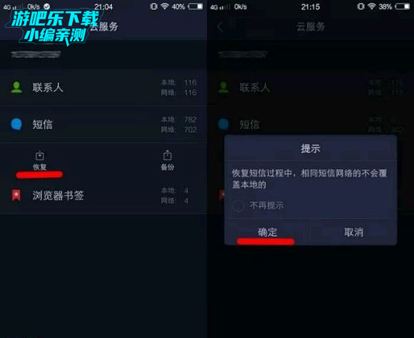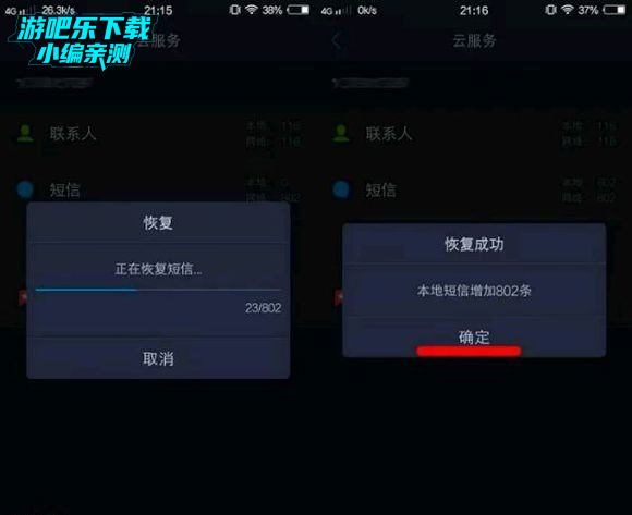 根据信息量,云服务很快通过网络将信息恢复到手机中,完成后点确定