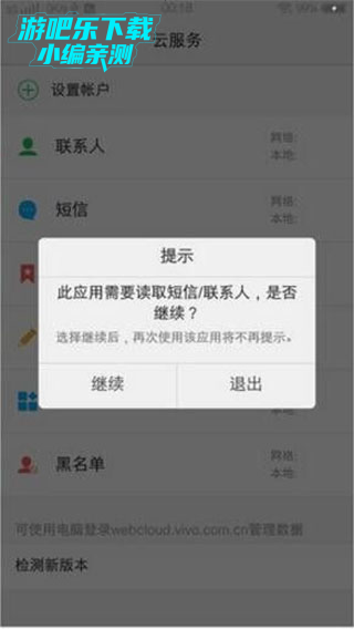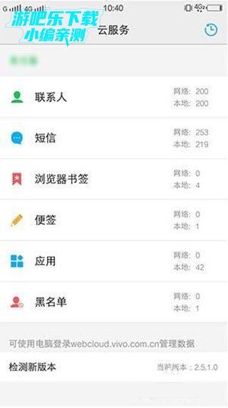 2、待进入“云服务”界面后,就可以看到当前vivo云所支持备份及恢复的手机数据类型了。Vivo提供联系人,短信,浏览器书签,便签,应用和黑名单六项的云同步功能。如图所示: