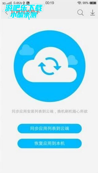 4、待进入“应用同步助手”界面后,就可以通过点击“同步应用数据到云端”进行手机数据的同步操作。当然也可以从"云端恢复手机数据“完成手机数据的恢复操作。