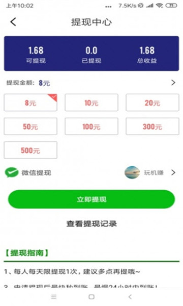 收益只需要满8元即可申请提现,可以提现在我们的微信钱包上,提现通常24小时内到账,长期稳定靠谱;