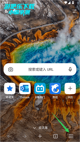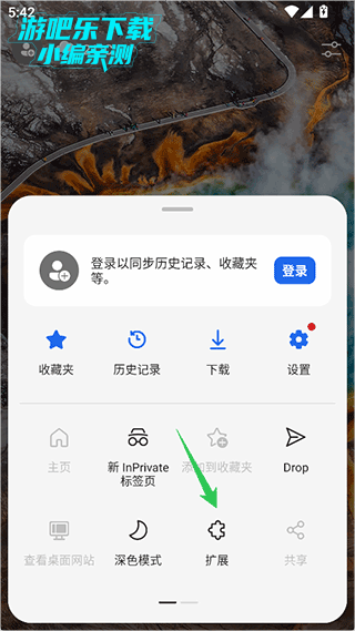 1、以手机版Edge Canary为例,进入Edge Canary安卓版后点击右下角的扩展功能图标(下图绿色箭头所指处)