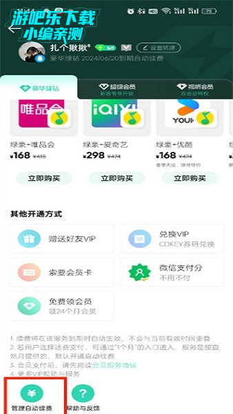 选择开通的会员类型,接着点击左下角的“管理自动续费”;