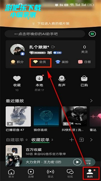 打开qq音乐后,点击右下角“我的”,并选择头像下面的“会员”;