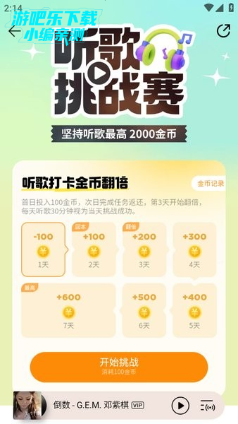 完成听歌挑战赛可以获得金币,每天听歌30分钟视为当天挑战成功;