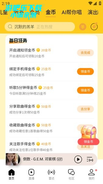 每日任务,听歌5分钟、关注歌手、收藏歌单、分享歌曲等,也都能领取金币;