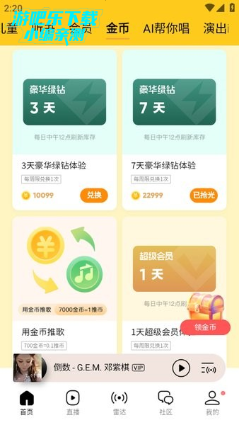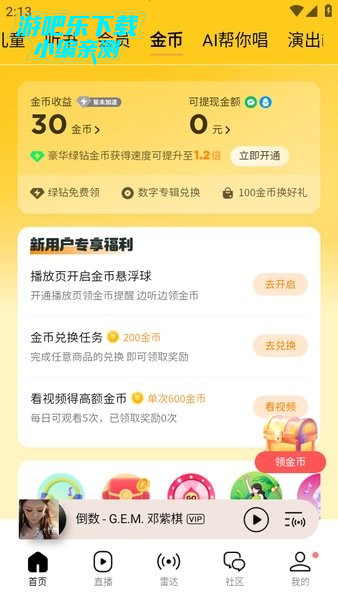 目前能免费获得qq音乐会员的方法就是通过金币兑换,在“首页”点击“金币”;