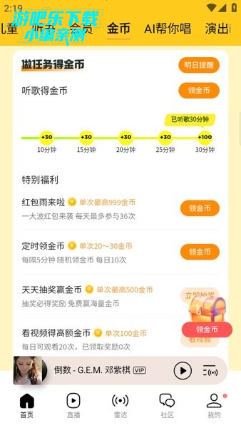 做任务得金币,包括了听歌、看视频、刷广告、邀请好友等,都可以获得金币;