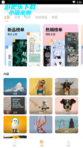4、点击分类,可以分类查看,除了主题外,还有字体,铃声,动态壁纸等资源