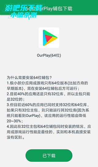 部分游戏及应用需要安装64位辅包才可以流畅运行。所以,为了保证在OurPlay下载的所有游戏及应用达到最佳的运行性能,建议你在进行完上述安装后,前往【我的】-【设置】-【64位OurPlay辅包下载】下载辅包。