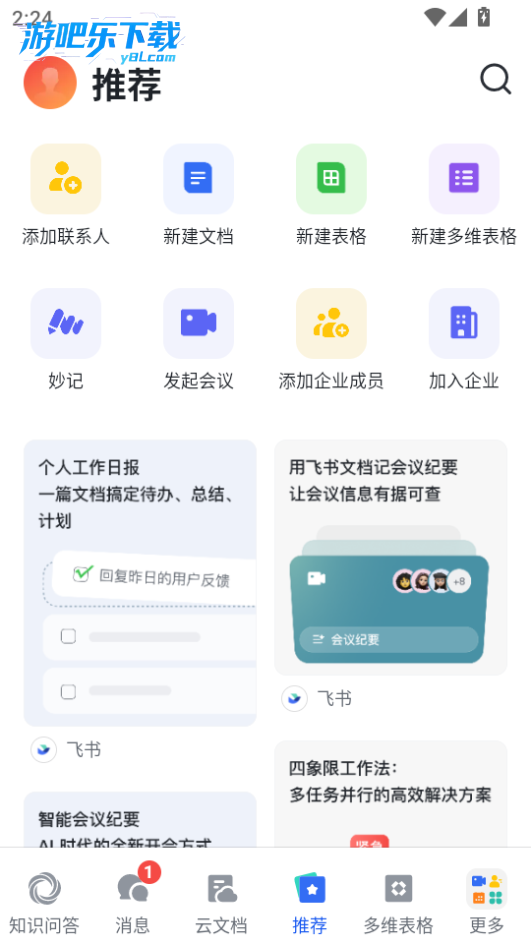 飞书文档app下载资源分享给大家。这是由字节跳动飞书上线的独立文档软件,以思维笔记、多维表格、双向链接作为主要功能,促进文档信息结构化办公和协同办公,促进办公效率的提升!