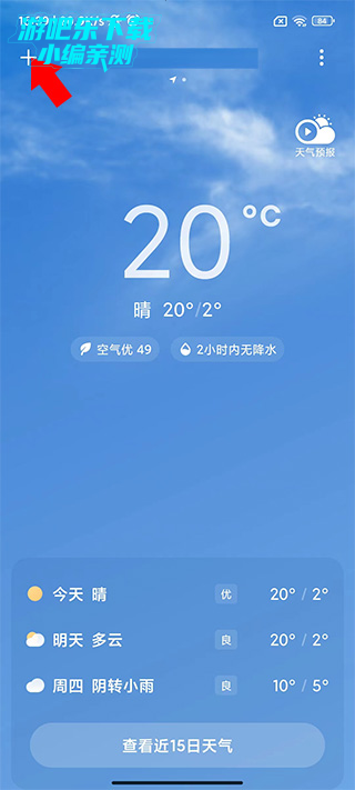 1、在本站下载并安装小米天气app,来到小米天气首页后点击右上角的“+”号添加城市