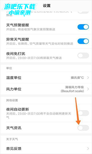 4、往下划,点击关闭天气资讯按钮,天气资讯不会弹出。