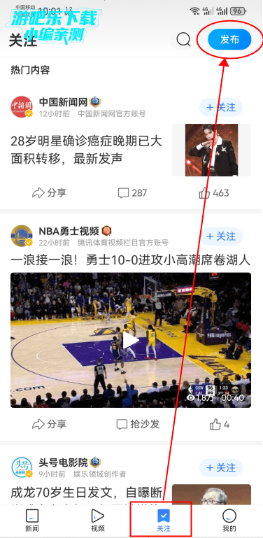 2、选择底部关注栏目,点击发布,即可进入发布页面