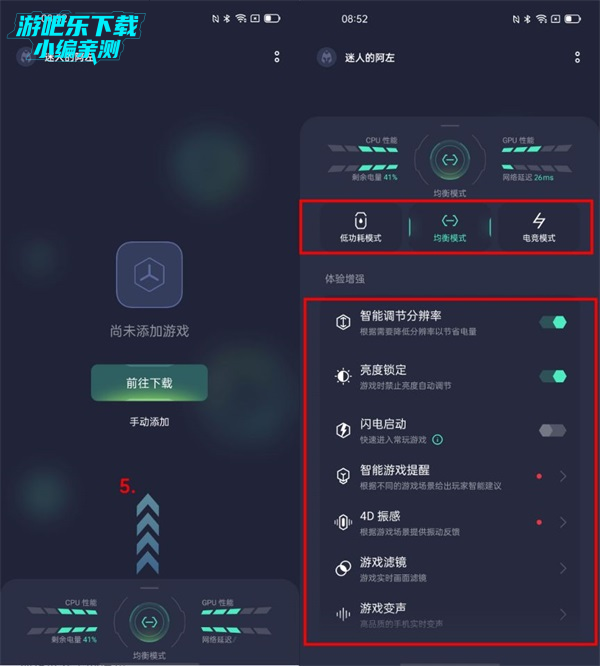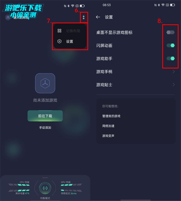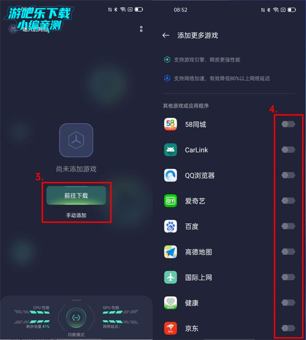 2、第一次打开,我们需要先添加游戏,如果手机里还没游戏,点击“前往下载”,如果已经有游戏的话,点击下方“手动添加”,打开对应游戏后的开关就可以添加了。
