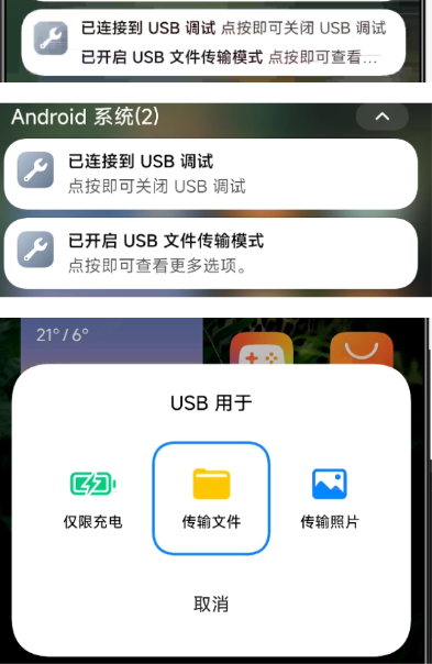 2、确保数据线正常,最基础的判定方法,当数据线连接PC和手机时,手机上会弹出 usb模式切换的提示 如 仅充电、文件传输等;