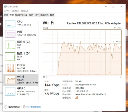 1、一般与WIFI速度相关,高清晰度的游戏画面WIFI接收速度流畅投屏一般需要1MB/s-2MB/s(8Mb/s-16Mb/s),高分辨率高刷手机要求更高,可以通过电脑中的任务管理器-性能查看WIFI速度(这里指局域网速度,非互联网速度)。卡顿时可以观察该数据,若速度无法达到要求可以更换更好路由器试试。