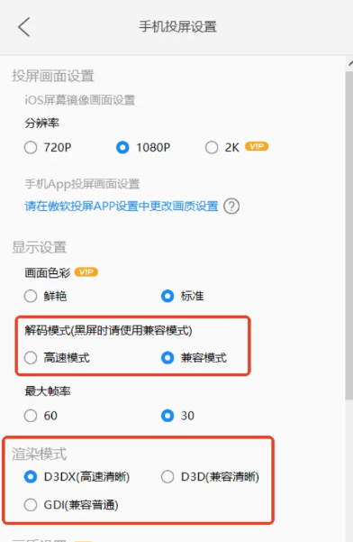 2、部分电脑设备存在解码渲染兼容的问题,碰到画面卡顿也可以尝试切换一下这些设置。点击电脑傲软投屏右上角设置-手机投屏设置。