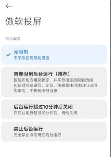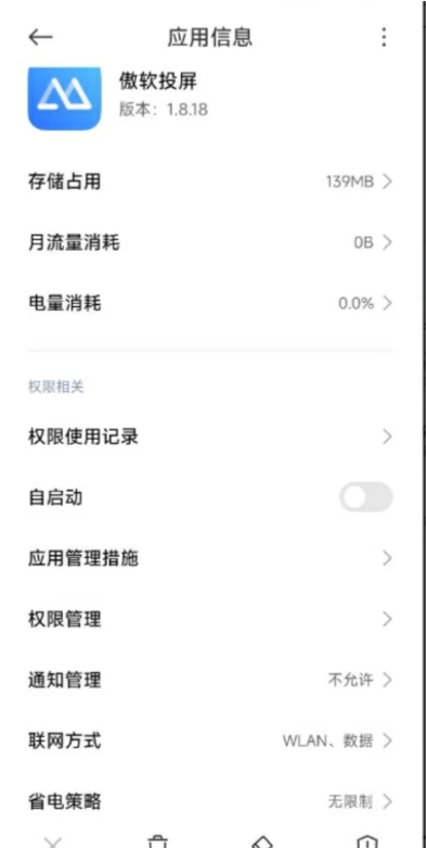 ②一些设备除开启悬浮窗权限以外,还需要允许傲软投屏后台运行,才能让投屏稳定在后台运行不中断。不同型号手机所在位置不一样,这里以小米手机为例 应用设置—>傲软投屏—>省电策略—>设置无限制