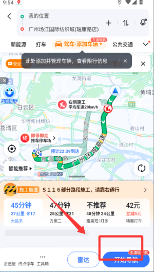 2、选择出行方式如驾车或公交,系统会推荐多条路线并显示实时路况。
