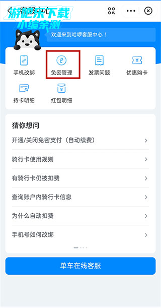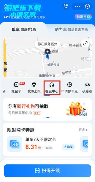 1、支付宝搜索哈哕出行后,点击单车,点击客服中心。