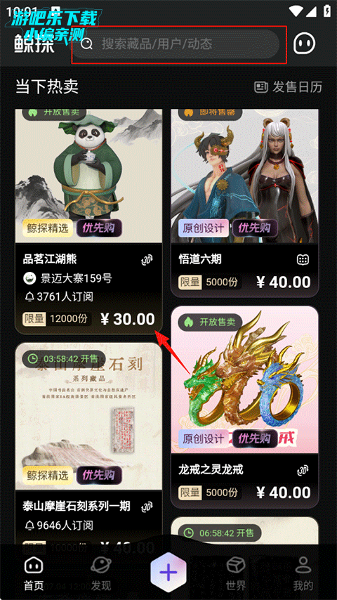 1、打开鲸探APP,在首页搜索你想要的数字藏品,点击进入详情页;
