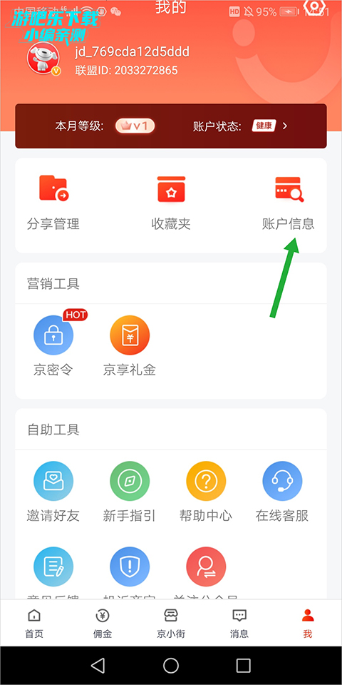 6、也可以点击京粉下方的“佣金”查看自己的返利信息及余额。