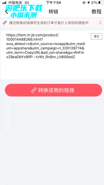 在打开的转链页面中将刚才的链接粘贴进去后点击【转换成我的链接】