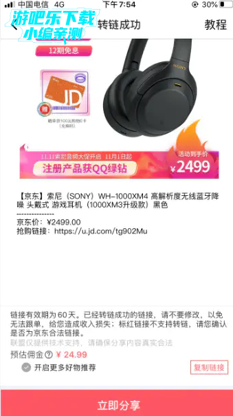 此时用户可以看到,转让完成后,将给出估计的佣金价格,用户点击页面底部【立即分享】,用户将商品分享到其它平台或者其他用户后就可以前往京粉app中的【佣金】页面中进行佣金提取