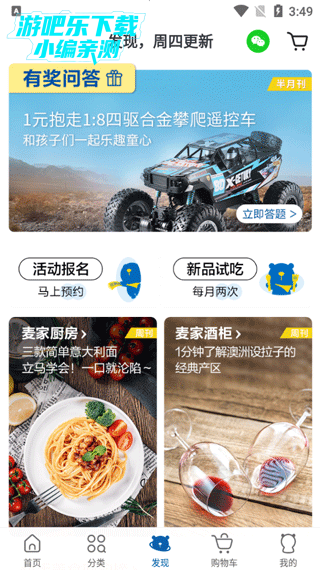 3、在首页我们可以看到每周特价、新品试吃、积分商城等功能