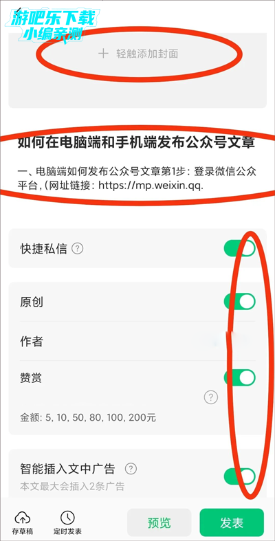 添加封面、标题、摘要、设置广告、原创声明、作者、等,最后点击右下角发表,完成文章发布。