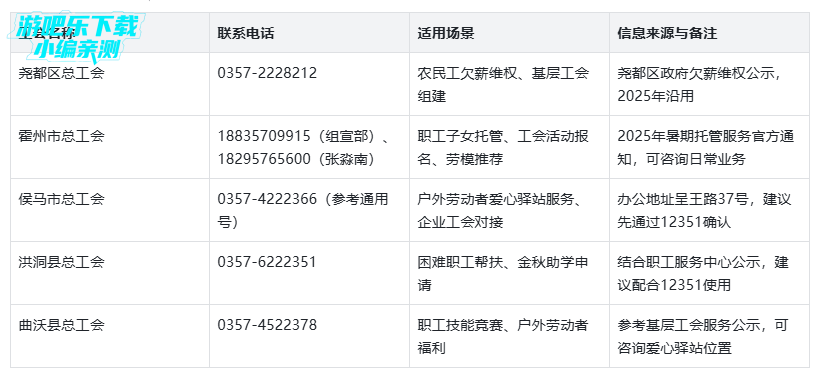 综合业务咨询(含活动报名、政策解读):0357-2080187 适用场景:咨询“夏送清凉”“会聚良缘”等普惠活动参与方式、工会政策细则,2025年“夏送清凉”活动官方指定咨询电话。