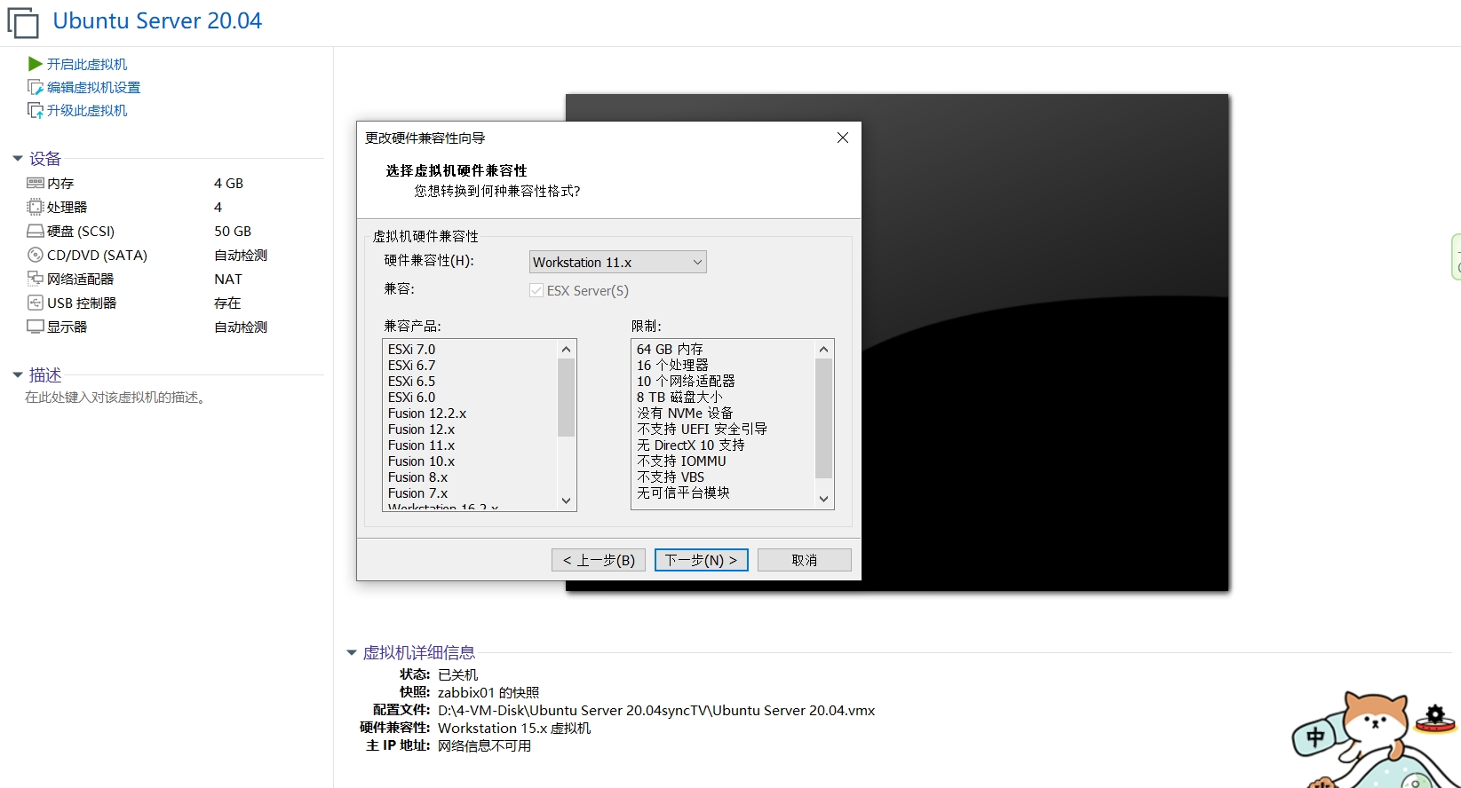 1、首先更改要迁移的虚拟机版本,将其改为VM11.0(因为我这里用的是ESXi6.7版本)