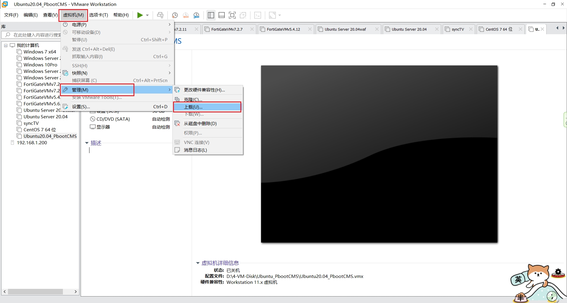 5、依次点击“虚拟机”----->“管理”----->“上载”,进行系统导入