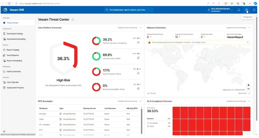 Threat Center:登录后首先展示的是一个集中化的仪表盘,名为 Threat Center,它突出了高风险异常、恢复点目标(RPO)问题以及其他环境中的关键洞察,为基础设施提供了一个即时的健康检查。